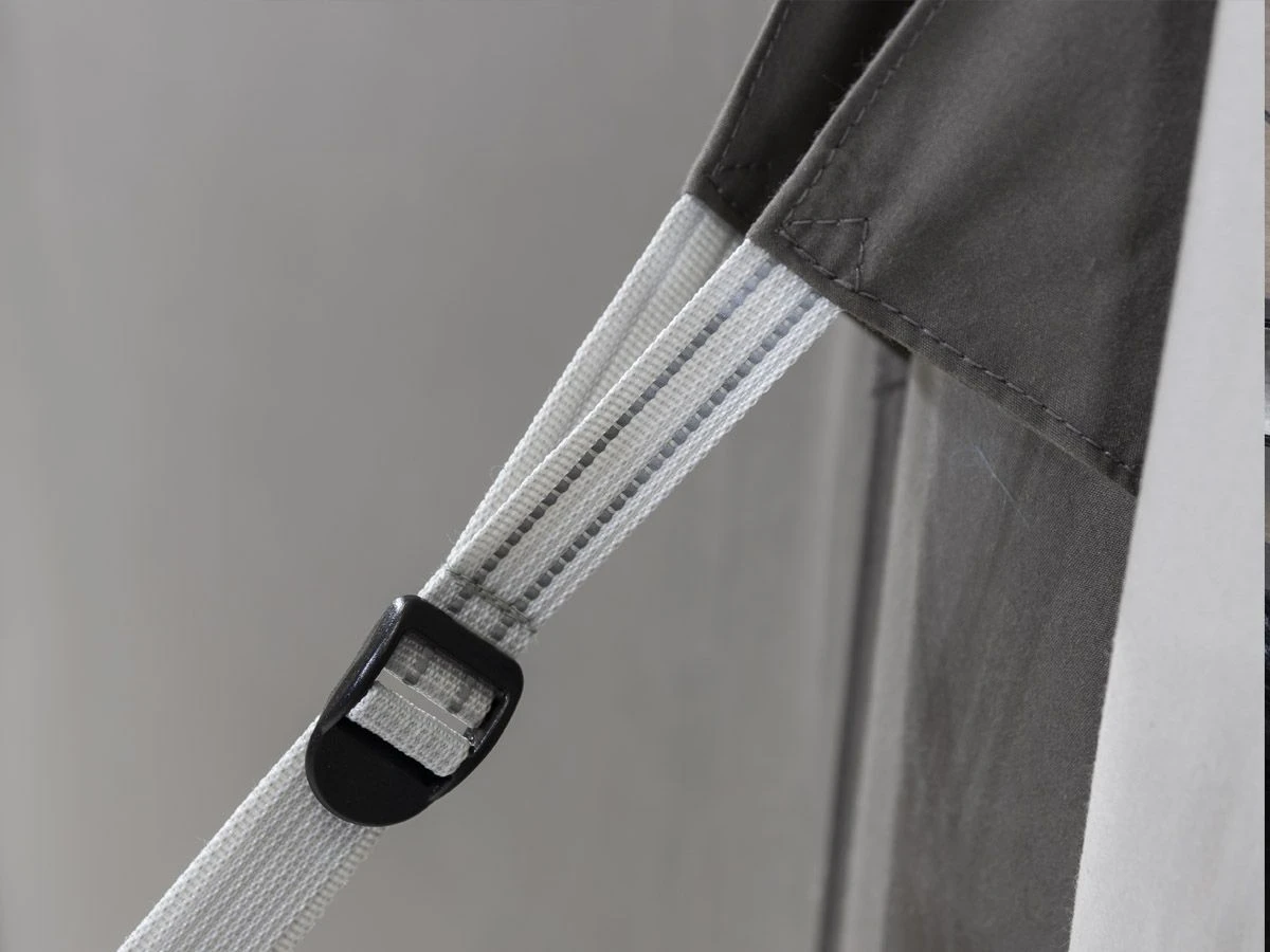De tent heeft standaard geen grote luifel. Deze is er los bij te kopen