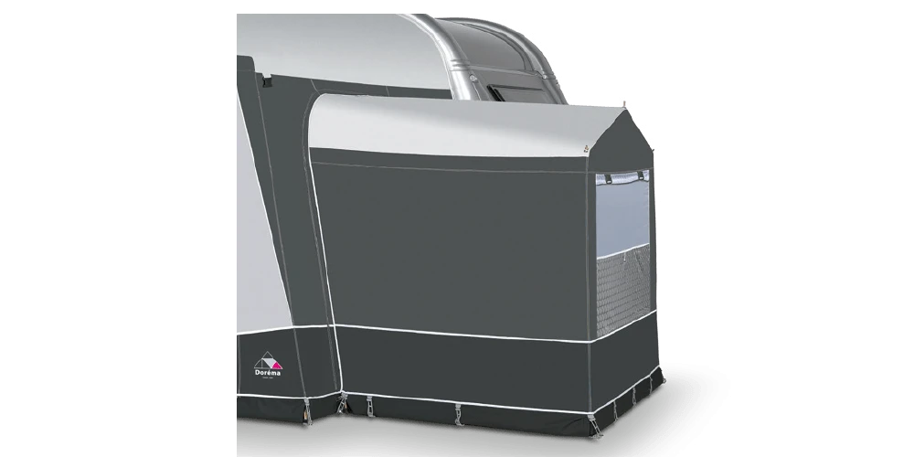 De Doréma Uitbouw Standaard is verkrijgbaar in stijlvol antraciet/grijs, passend bij je Monza voortent. Standaard is deze uitgerust met een stevig 25 mm stalen frame, maar voor wie de voorkeur geeft aan een lichtere optie, is er een aluminium frame beschikbaar. Voor nog meer gemak is de uitbouw uitbreidbaar met een universele Doréma binnentent, perfect voor wie op zoek is naar nog meer comfort.