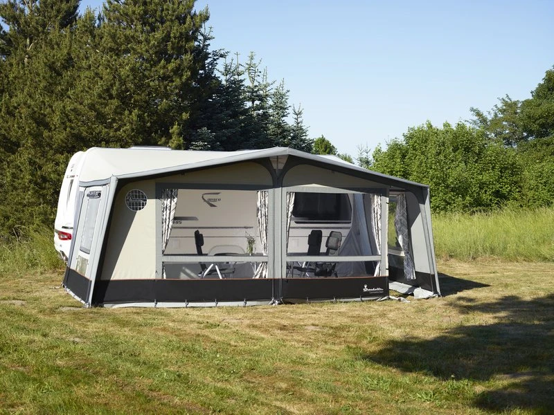 De grote ramen in de front- en zijpanelen zijn rond afgewerkt in de bovenste hoeken en zorgen samen met de hoge ramen achter in de zijwand voor voldoende licht in de gehele voortent. Het ademend Isacryl materiaal is bijzonder kleurvast en zorgt samen met de ingebouwde nokventilatie voor een prettig binnenklimaat. Op warme dagen bieden de insectenhorren in de beide zijwanden voldoende ventilatie.