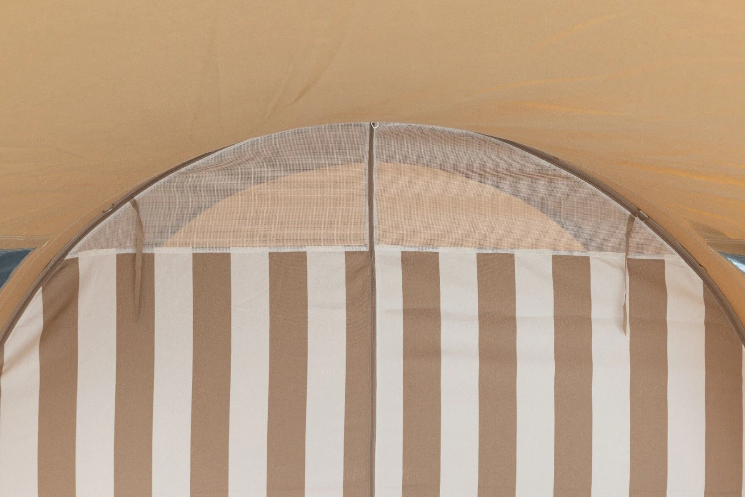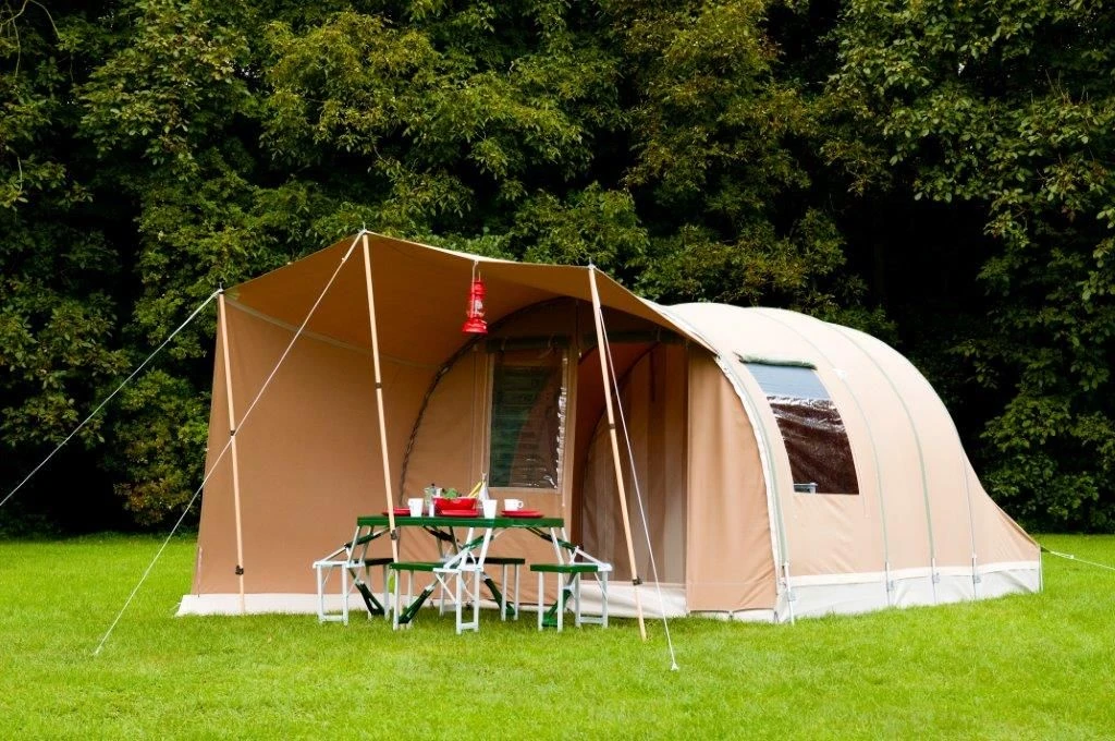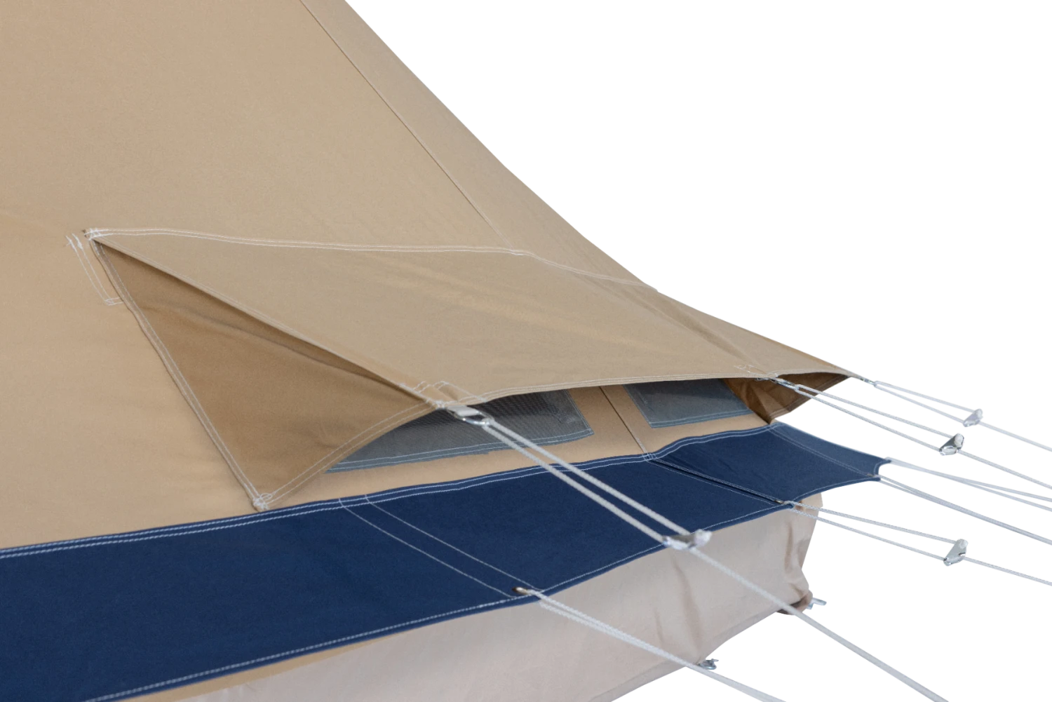 Maar hoe zit het met de toegankelijkheid? Geen zorgen! De tent heeft een handige klapkuip, waardoor je de entree eenvoudig kunt verlagen voor een moeiteloze in- en uitstap. En wat betreft het materiaal, waarom zou je kiezen voor iets anders dan het beste? Het Ten Cate tentdoek van 100% katoen versterkt niet alleen het ademende vermogen van de tent, maar zorgt ook voor een aangenaam klimaat binnenin, ongeacht het weer.