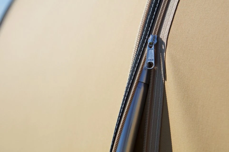 Zoek je ook bescherming tegen zon, wind en regen? De ruime, moderne luifel die je eenvoudig aan de tent rits, biedt voldoende schaduw en beschutting, zodat je onder alle weersomstandigheden comfortabel kunt ontspannen.