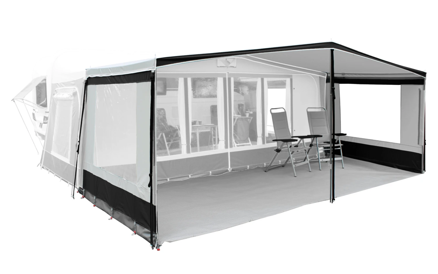 De afritsbare zijwanden zijn voorzien van grote ramen. De buistunnels zijn voorzien van ritsen zodat u de tunnel gemakkelijk kunt openen. Dankzij de diepte van 240cm en de aansluitsplitten op de achterzijde van de Genova biedt de luifel beschutting tegen wind, regen en zon.