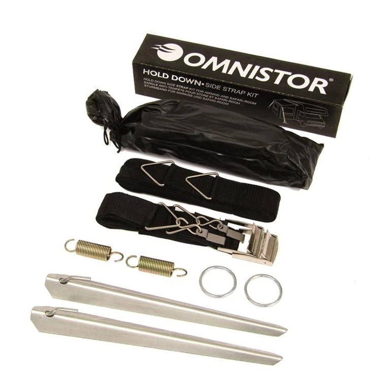 Complete stormband set voor het vast zetten van Thule luifels. De set bestaat uit 2 zwarte riemen van 3 meter, grondpennen en 2 veertjes zodat de stormband verend vermogen heeft om het luifel goed vast te zetten maar wel lichte bewegingen kan verwerken zodat het doek niet scheurt.