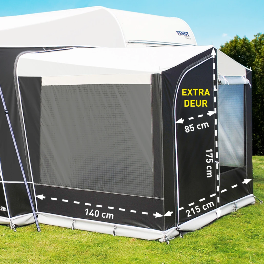 De Dynamic uitbouw de luxe rits je gemakkelijk aan de voortent vast. De uitbouw heeft een extra deur aan de buitenkant en een raam met ventilatiegaas. De uitbouw kan aan beide zijden worden geplaatst.Â